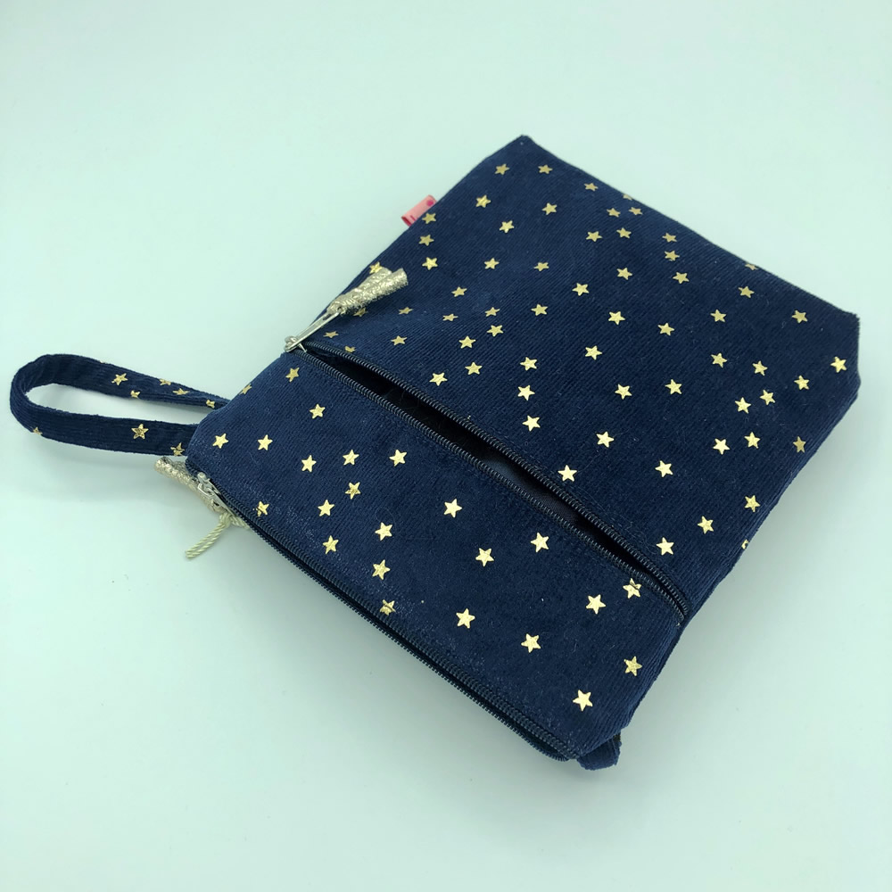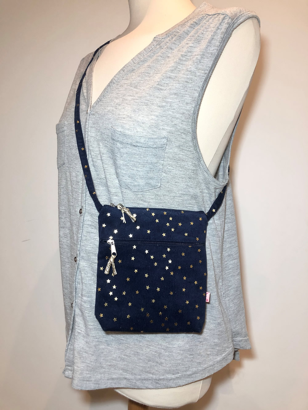 This handy cross body purse in navy starred corduroy is super versatile.  With a zip on the top and across the front, this on-trend bag is ideal for keeping those everyday essentials safe.  Popular with dog walkers, and perfect for holdiays, this bag will make a great gift for all ages.